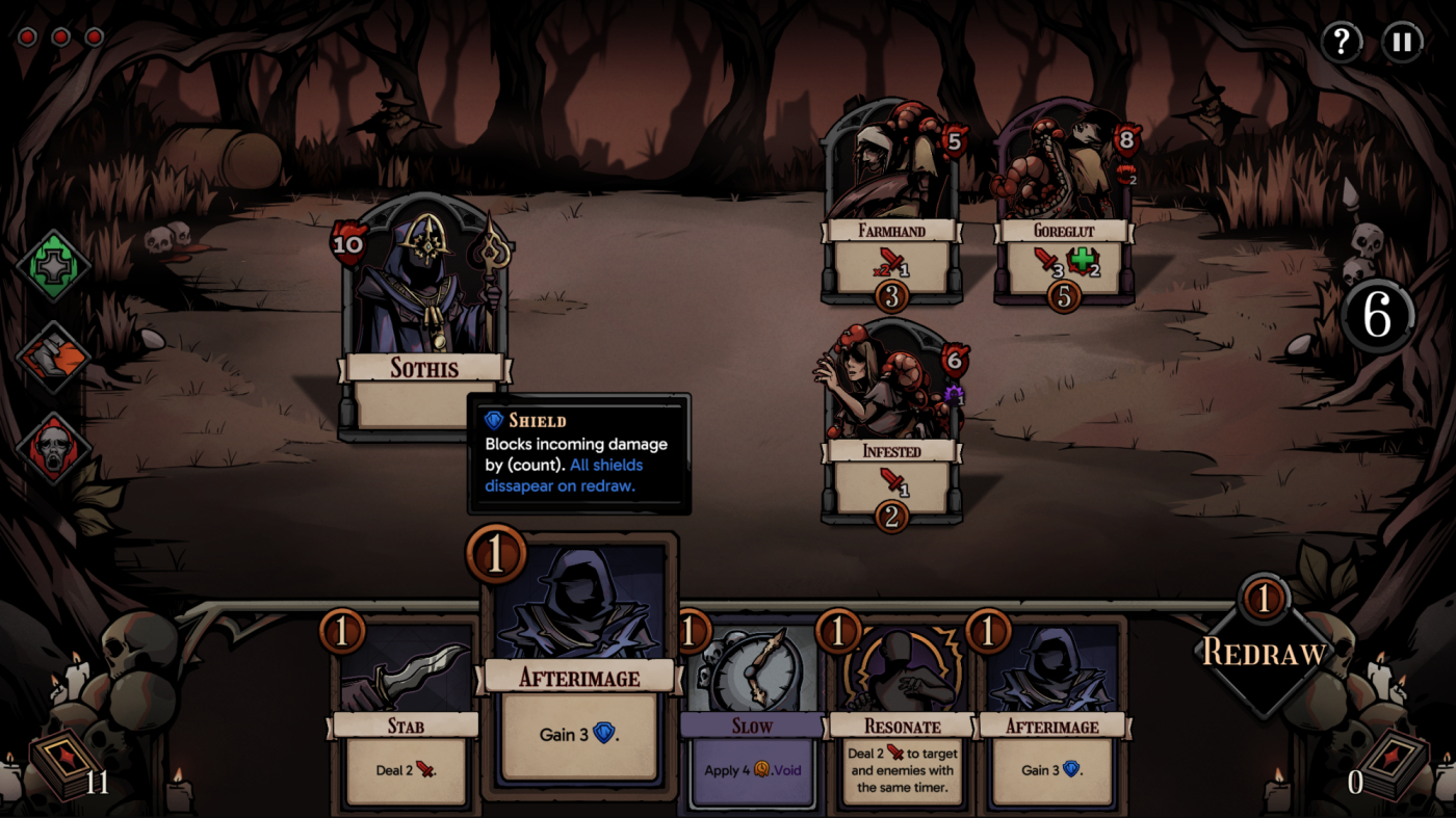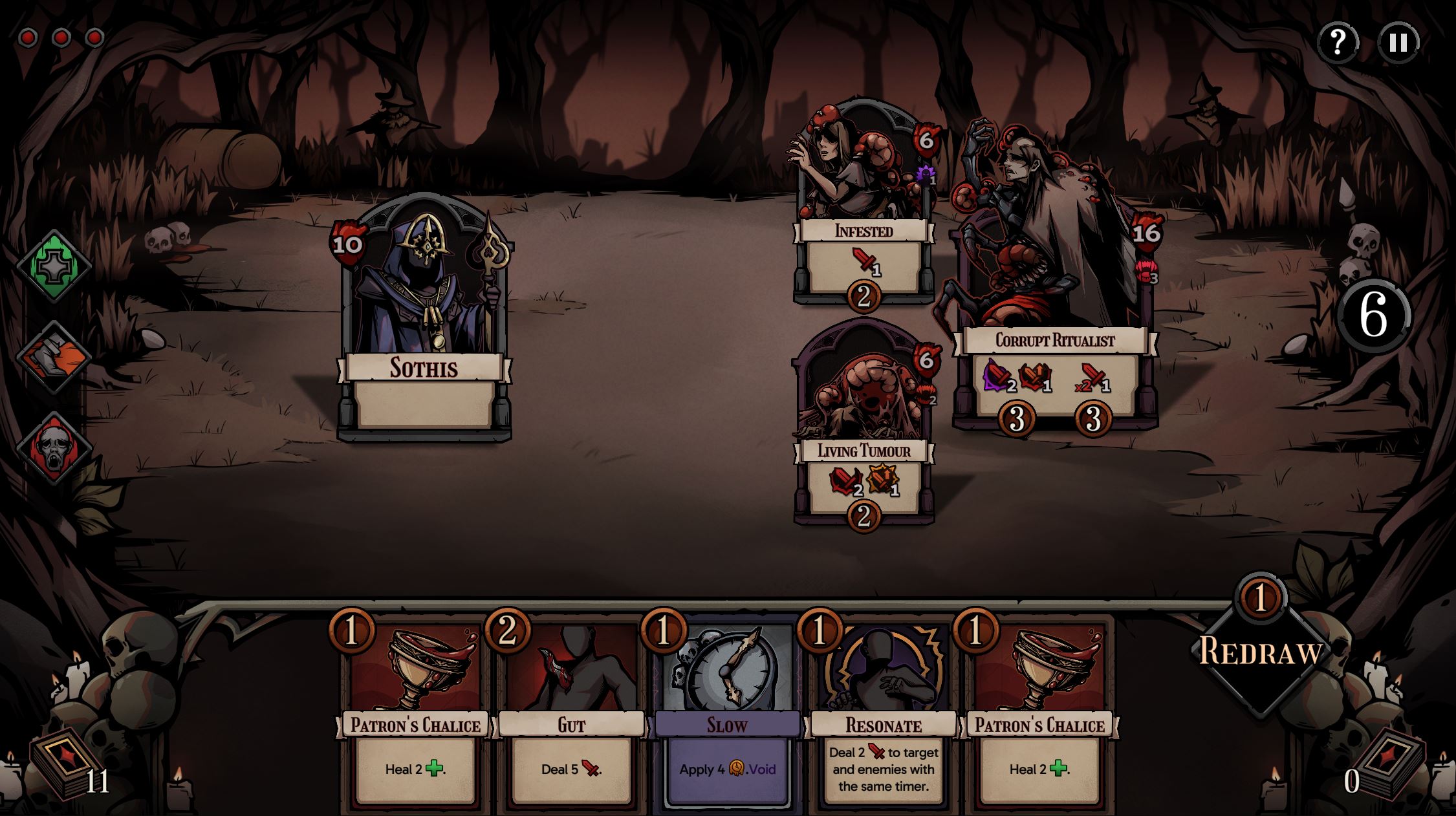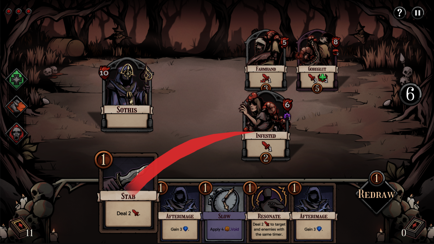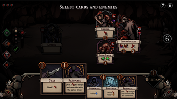 - Variable turn system: playing cards costs “time” instead of resources, and the actions of each enemy are tied to a timer. The turn order constantly changes as enemies take different actions, keeping you on your toes.